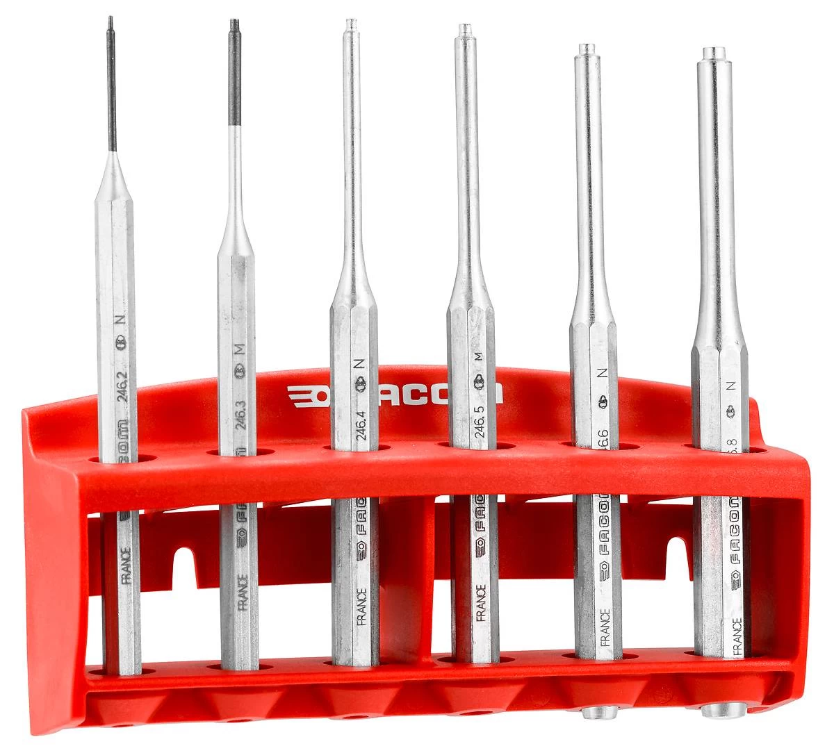 Tip fits accurately into centre of spring pin, with shoulder on pin, allowing easy removal. Supplied in steel rack to fit Facom wall panel