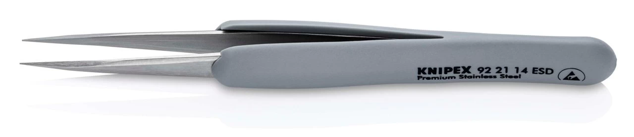 - 92 21 14 ESD Precision Tweezers with rubber handles ESD Electrically dissipative coating: Universal tweezers in the ESD version equalize differences in electrical potential between their user and the workpieces in a controlled manner.